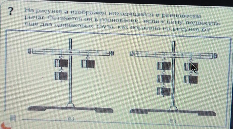 На рисунке изображён рычаг, находящийся в равновесии. если к нему подвесить ещё два одинаковых груза, как показано на рисунке б?