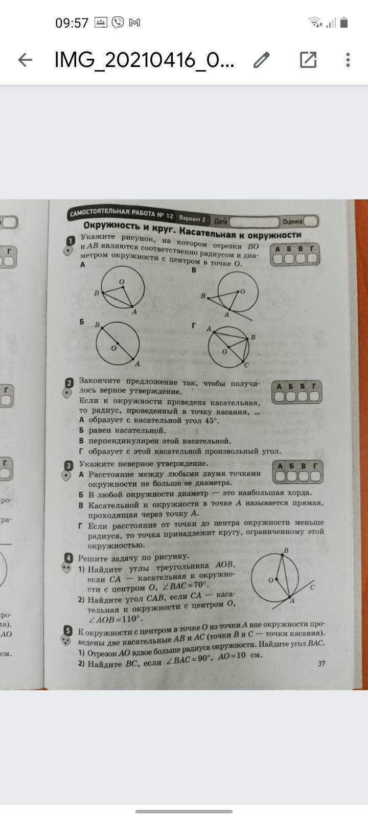 4. 1) угол ОАС=90°, угол ОАВ=90°-70°=20°, ОА=ОВ (как радиусы), треугольник ОАB - равнобедреный, угол ОАВ=углу ОВА = 20°, угол АОВ= 180°-(20°+20°) = 140°