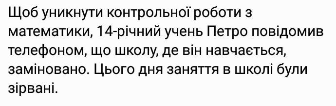 Петро вчинив злочин згідно статті 259 КК України. Завідомо неправдиве повідомлення про загрозу безпеці громадян, знищення чи пошкодження об'єктів власності.
