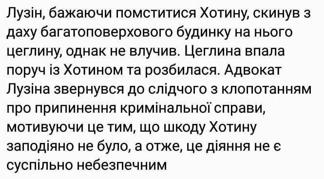 Лузін, бажаючи помститися Хотину, міг вдатися до злочину, передбаченого ч.1 ст. 121 КК України - умисне тяжке тілесне ушкодження. Проте оскільки цеглина не влучила в Хотина, Лузін нестиме відповідальність за ст. 1163-1165 ЦК України - Створення загрози життю, здоров'ю, майну фізичної особи. Шкода, завдана громадянину Хотину, відшкодовуватиметься відповідно до цього кодексу.