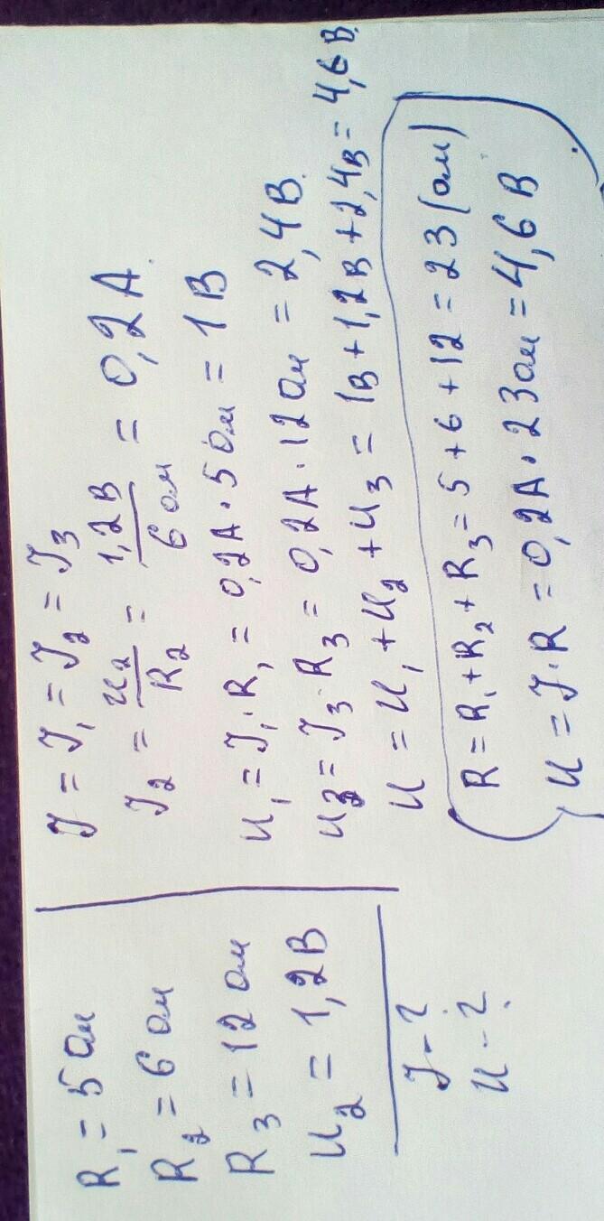 Объяснение: при последовательном соединении сила тока на всех потребителях одинакова, а напряжение равно сумме напряжений на каждом потребителе. Общее сопротивление равно сумме сопротивлений каждого потребителя: R=R1+R2+R3=5+6+12=23 Ом;