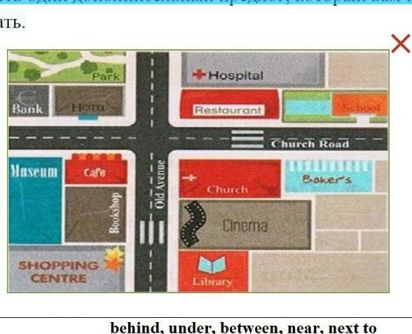 1) The school is._________ the restaurant 2) The baker's is______ the school 3) The cinema is ________ the church and the library 4)The park is _______bank Слава under,next to , near,behind,between