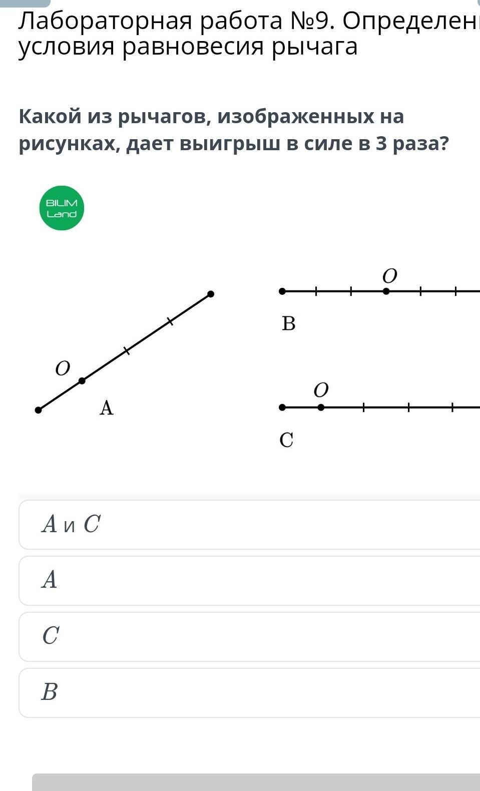 А и С. У них разные плечи. Одно в 3 раза длиннее другого. Значит и силу к длинному плечу можно приложить в 3 раза меньше из условия равновесия рычага. А В - равноплечий рычаг. Т.О - опора.