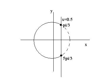Начертим прямую х = 0,5. Точки пересечения с окружностью: π/3 и 5π/3. Вся часть окружности, что левее прямой - и есть решение данного неравенства. Точки пересечения прямой и окружности входят в решение.