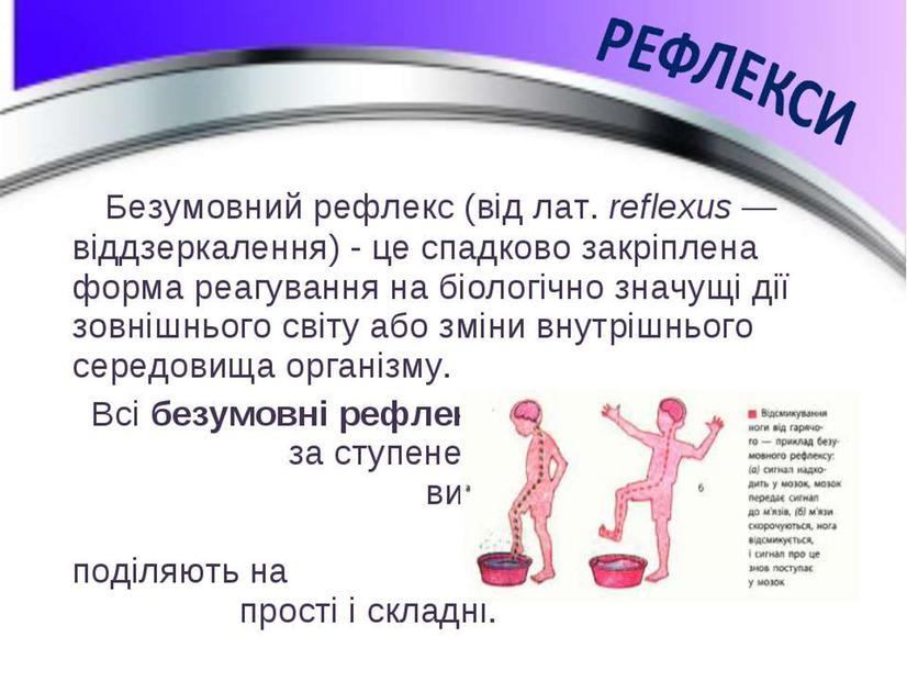Ответ:Поняття «рефлекс» було введено французьким ученим Р. Декартом більше 300 років тому. ... Безумовні рефлекси — це природжені рефлекси, що передаються спадково, сформовані до моменту народження. Вони є видовими, відносно постійні, здійснюються за участю спинного мозку, стовбура і підкіркових ядер головного мозку.
