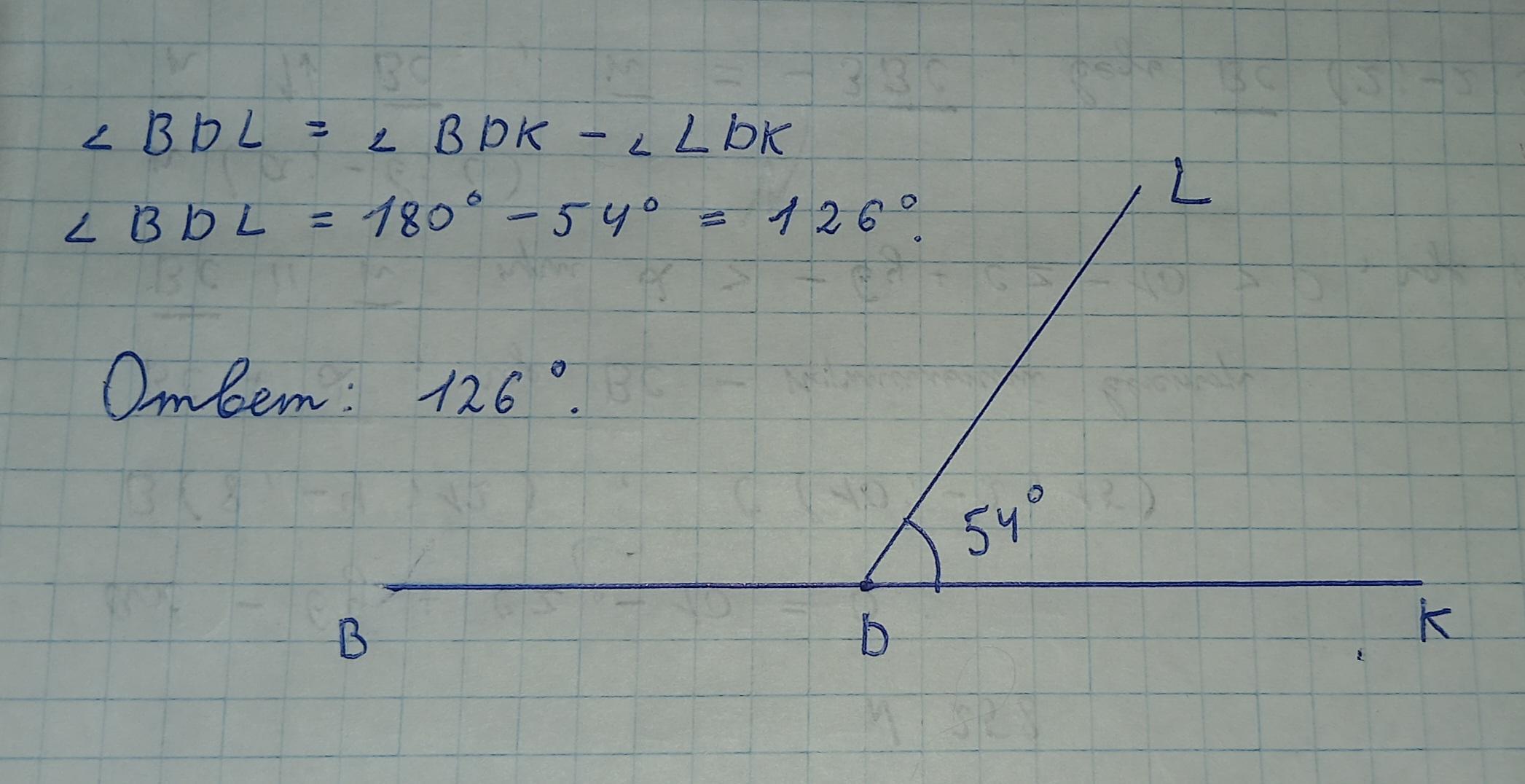 Из вершины развернутого угла BDK проведен луч DL, который образует угол 54º со стороной DK. Определи градусную меру угла BDL. помогите