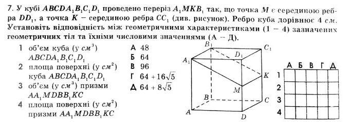 У кубі АВCDA1B1C1D1 проведено переріз А1МКВ1 так, що точка М є серединою ребра DD1, a точка К - серединою ребра СС1. Ребро куба дорівнюс 4 см. Установіть відповідність між геометричними характеристиками (1 - 4) зазначених геометричних тіл та їхніми числовими значеннями (А - Д).