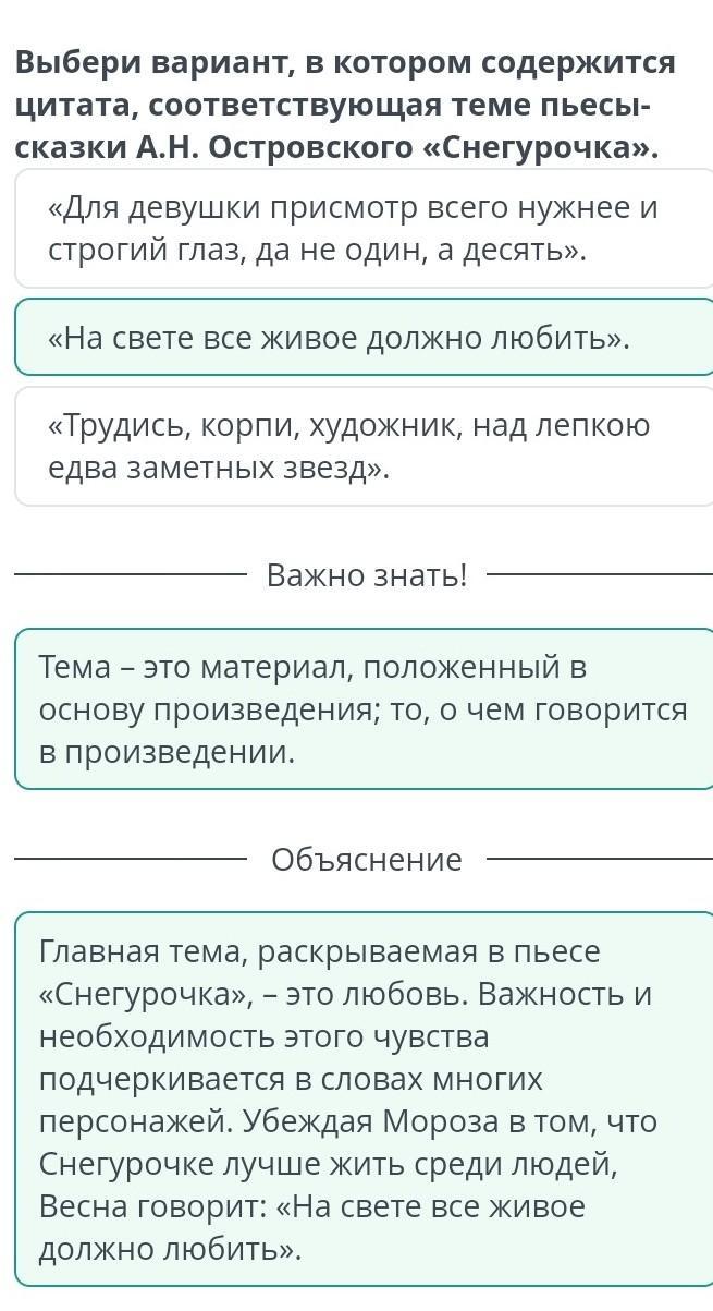 Выбери вариант, в котором содержится цитата, соответствующая теме пьесы-сказки А.Н. Островского