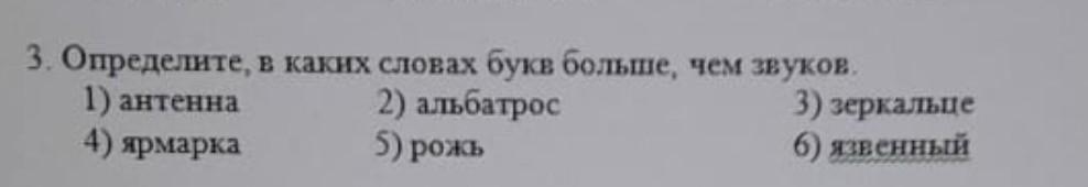 3. Оприделите, в каких словах букв больше, чем звуков.