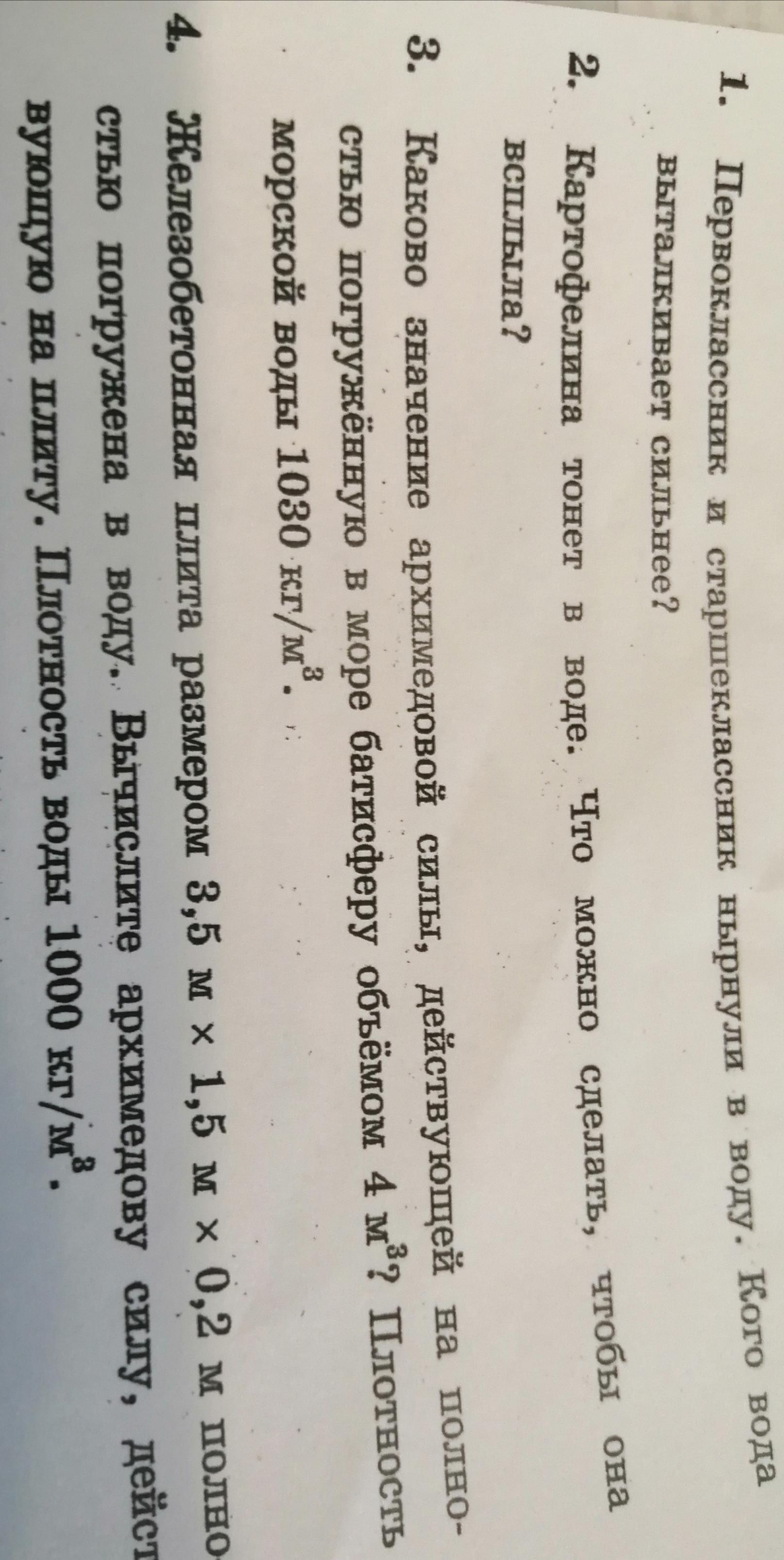 1. Объём старшеклассника больше, значит вода выталкивает его сильнее.