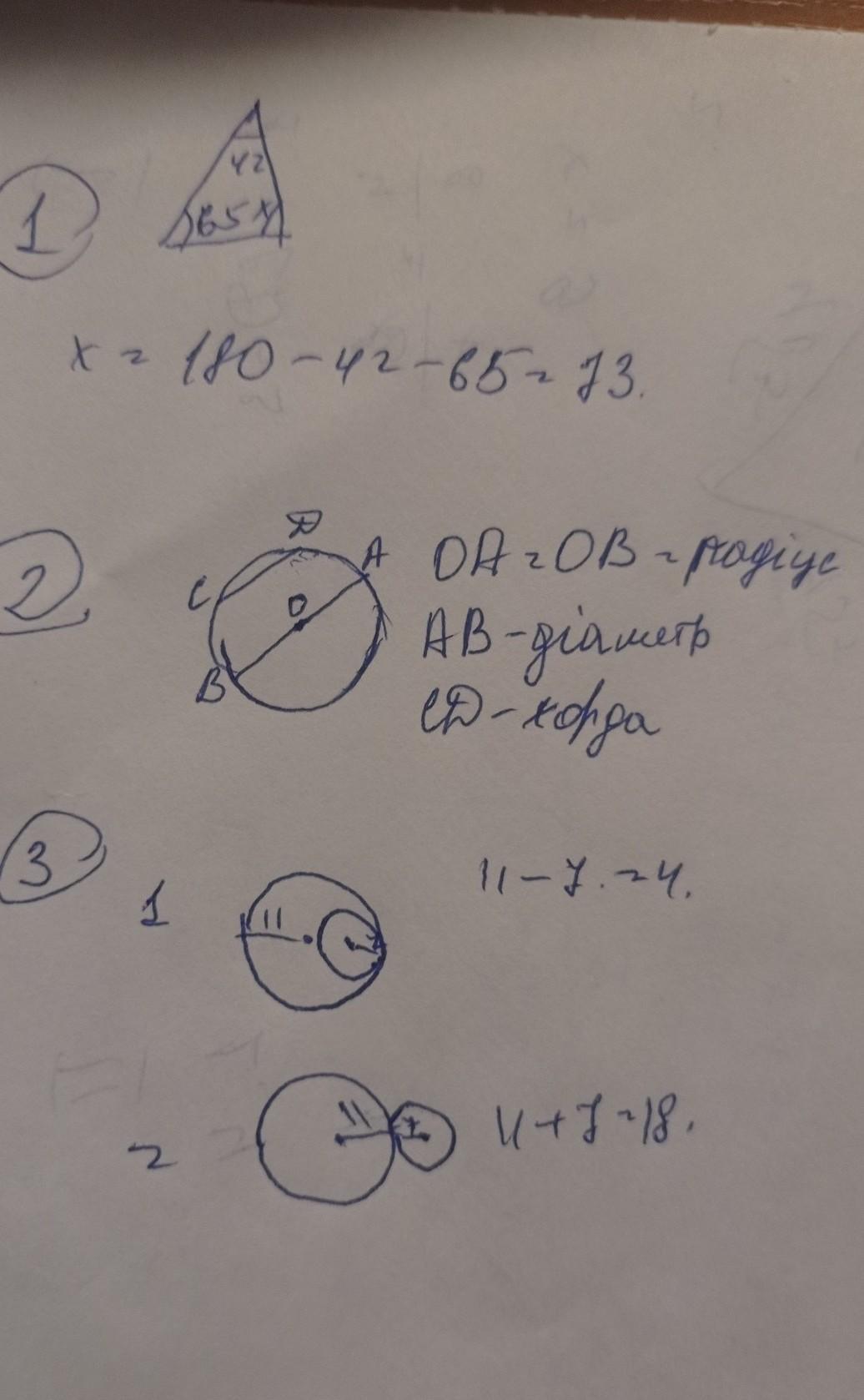 1) Знайди третій кут трикутника якщо два йокути дорівнює 65° і 42°