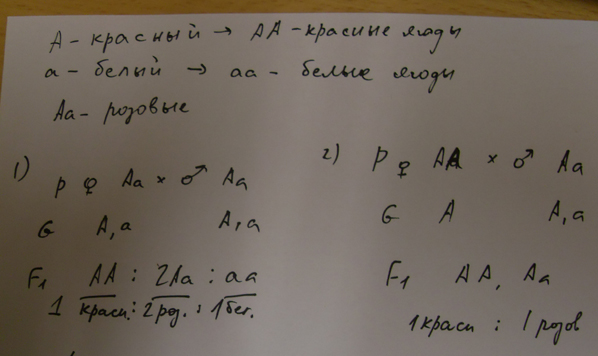 Растения красноплодной земляники при скрещивании между собой всегда дают потомство с красными ягодами,а растения белоплодной земляники- с белыми ягодами. В результате скрещивания обоих сортов друг с другом получаются розовые ягоды. Какое потомство возникает при скрещивании между собой гибридных растений земляники с розовыми ягодами? Какое потомство получится, если опылить красноплодную землянику пыльцой гибридной земляникой с розовыим ягодами?