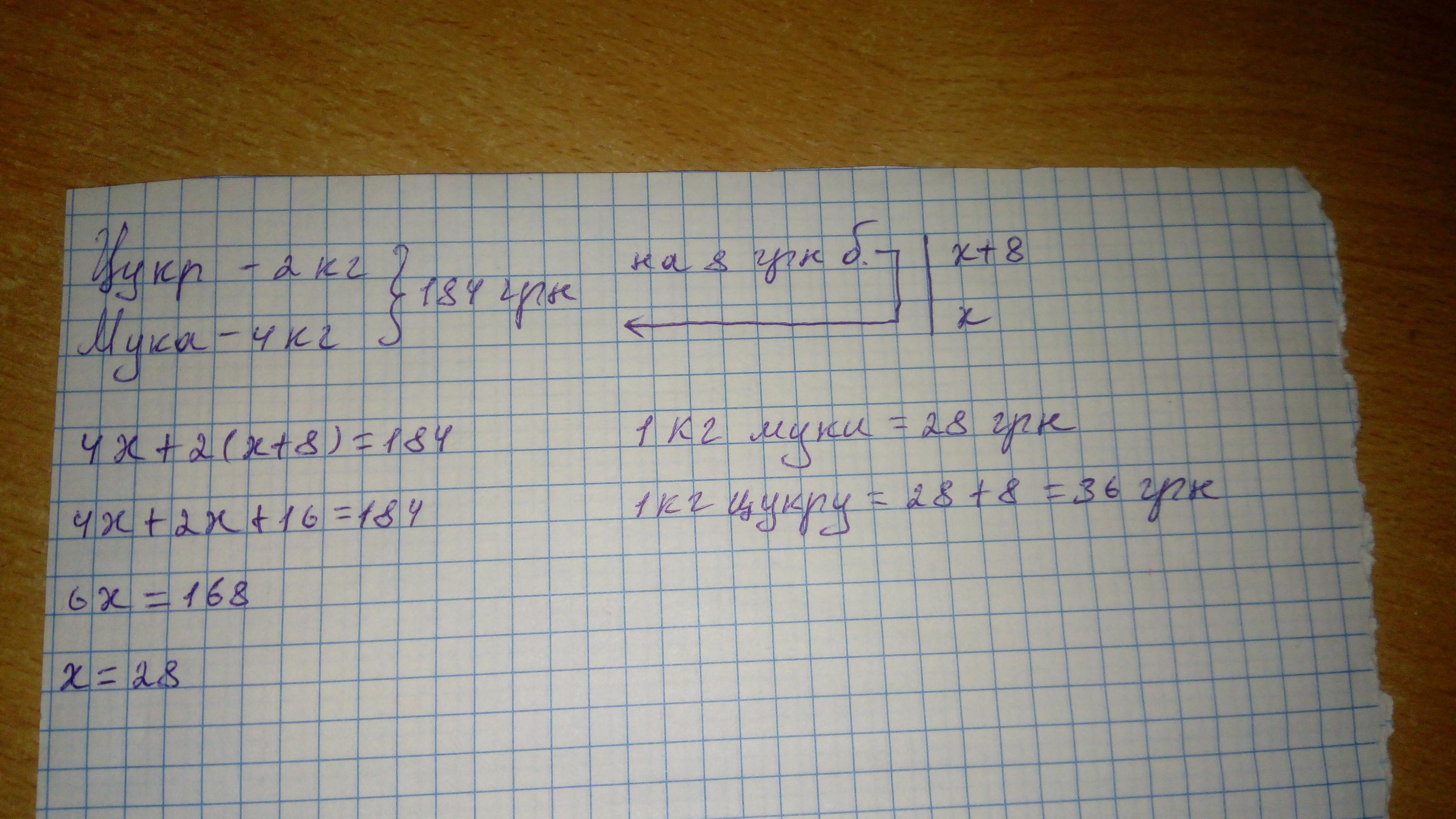 за 2 кг цукру і 4 кг муки заплатили 184 грн. скільки коштує кілограм цукру і скільки-кілограм муки якщо цукор дорожчий за муку на 8 грн