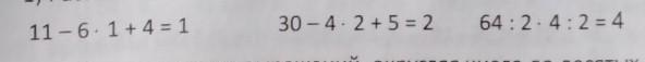 11-(6*1+4)=1 30-4*(2+5)=2 64:(2*4):2=4