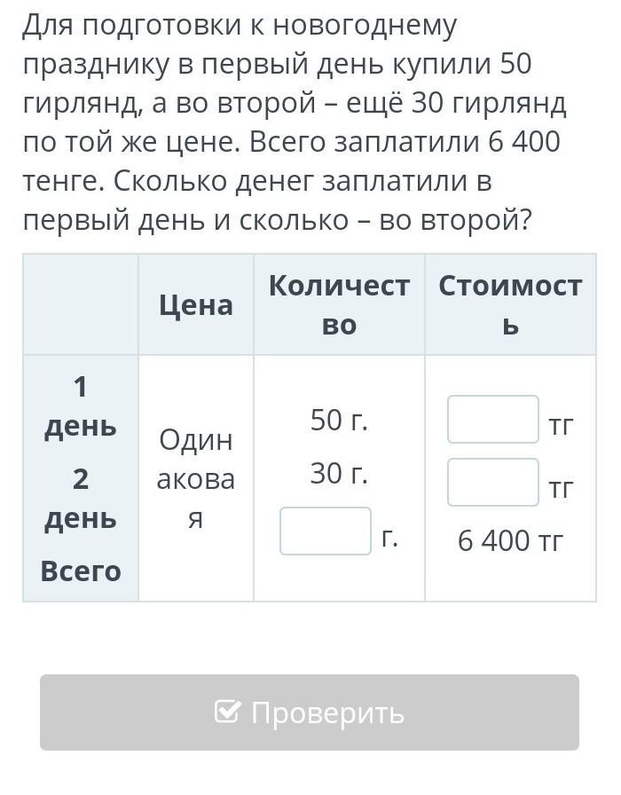 Для подготовки к новогоднему празднику в первый день купили 50 гирлянд, а во второй – ещё 30 гирлянд по той же цене. Всего заплатили 6 400 тенге. Сколько денег заплатили в первый день и сколько – во второй?