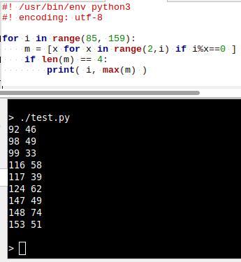 Для каждого найденного числа запишите через пробел само число и наибольший делитель этого числа (кроме самого числа). Каждая следующая найденная пара пишется с новой строки в порядке возрастания первого числа. Например, если подошло два числа: 10 и 21, необходимо записать в ответ: