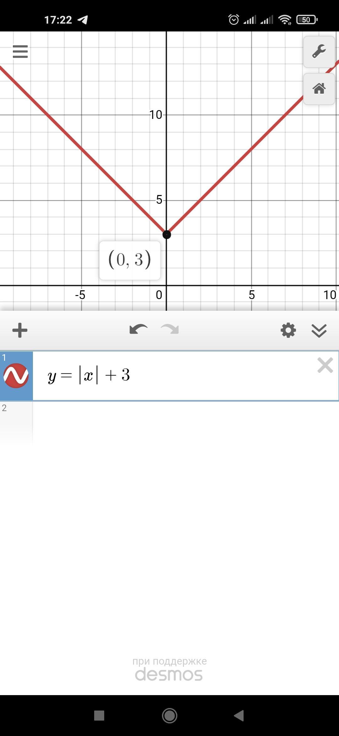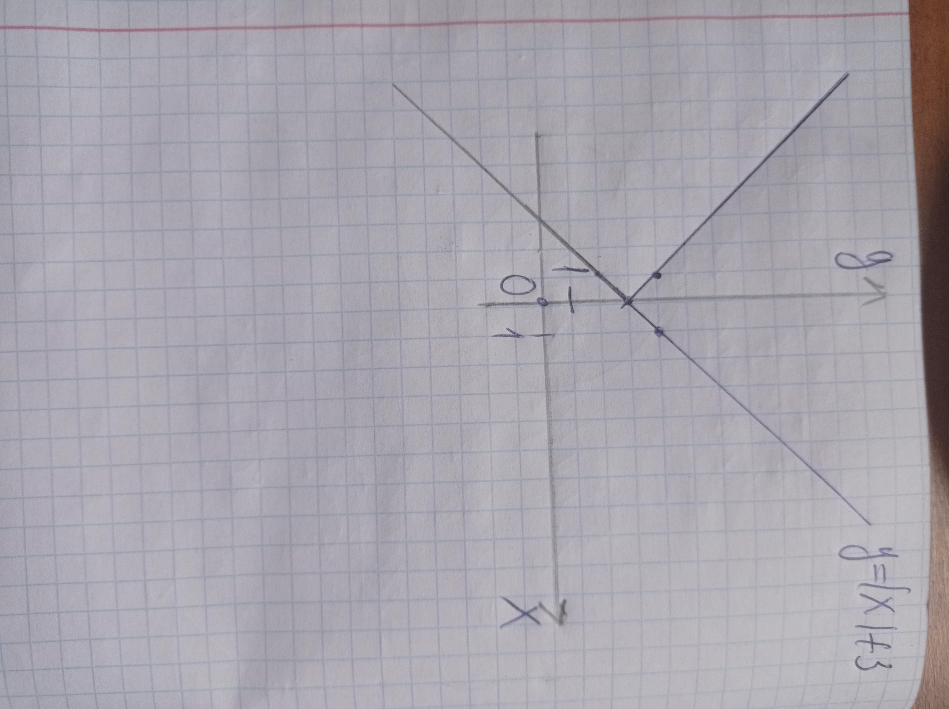 Это обычный график y=x просто смещен на 3 клеточки вверх, ну и посколько |x|=y делает так, что y всегда положительный, а х может быть как и положительным так и отрицательным, мы просто отражаем ту часть которая ниже нуля, ну или просто можно подставлять значения, но на более сложный графиках это бывает тяжеловато