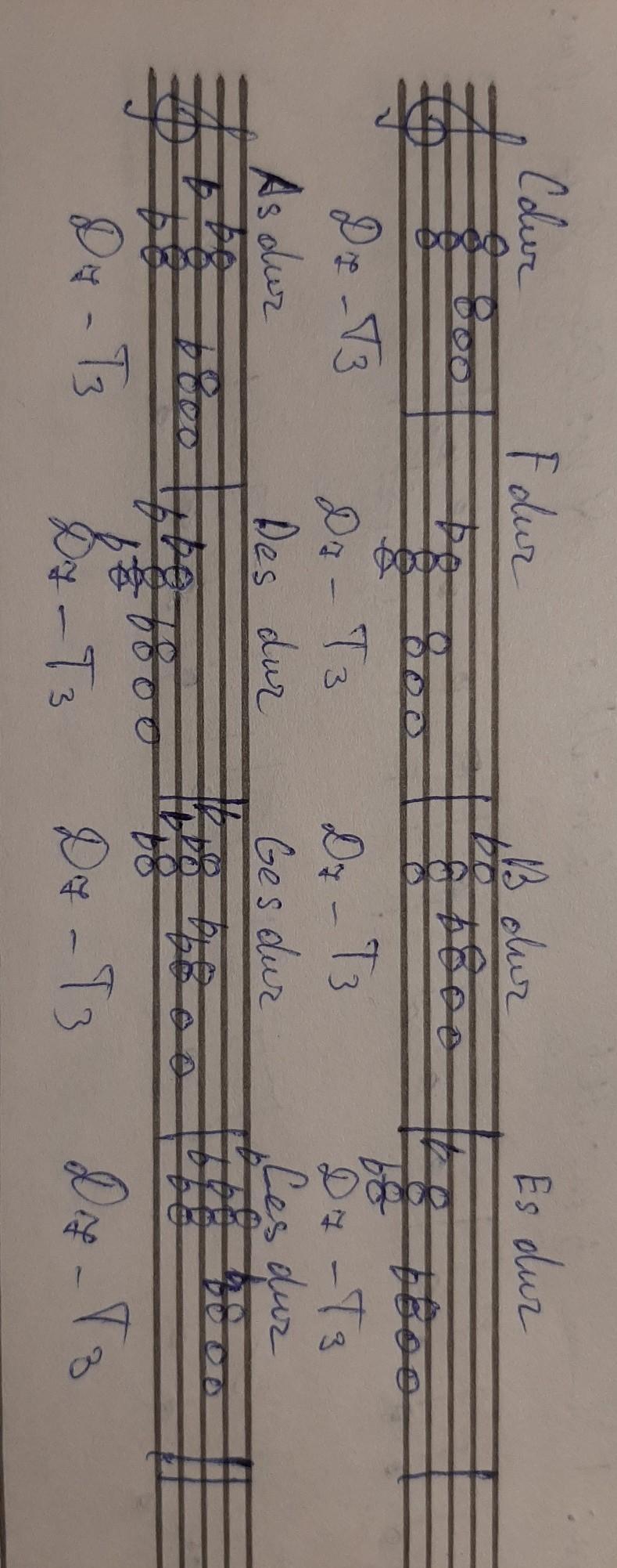 Сыграйте D7-Т3 по мажорным тональностям квинтового круга в сторону увеличения числа бемолей.
