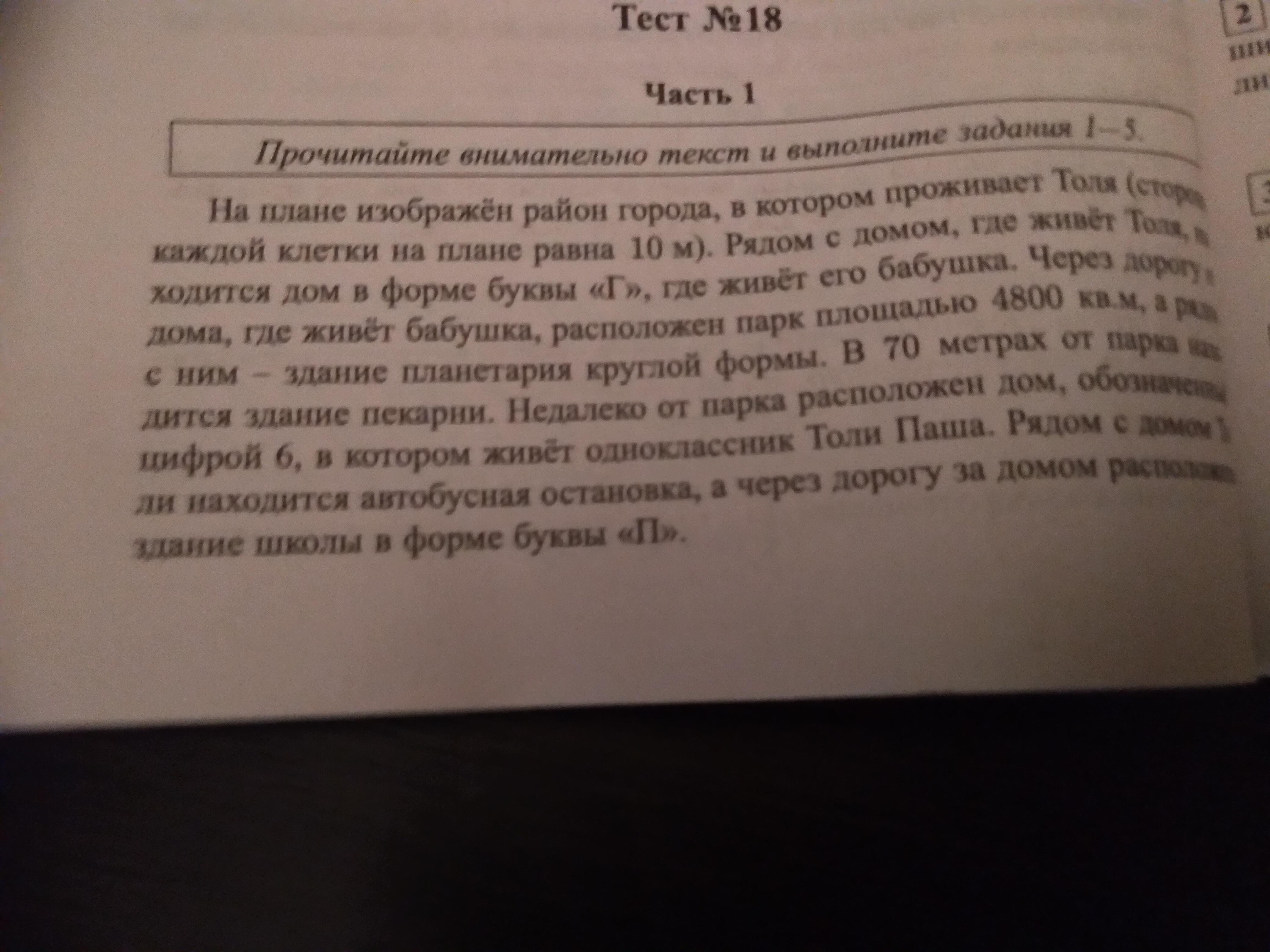 На плане изображён район города в котором проживает Толя сторона каждой клетки на плане равна 10 м рядом с домом Где живет Толя находится дом в форме буквы "г " где живёт его бабушка через дорогу от дома где живет бабушка расположен парк площадью 4800 квадратных метров а рядом с ним здание планетария округлой формы в 70 м от парка находится здание пекарни недалеко от парка расположен дом обозначенной цифрой 6 в котором живёт Одноклассник Толи Паша рядом с домом Толей находится автобусная остановка А через дорогу за домом расположено здание школы в форме буквы п