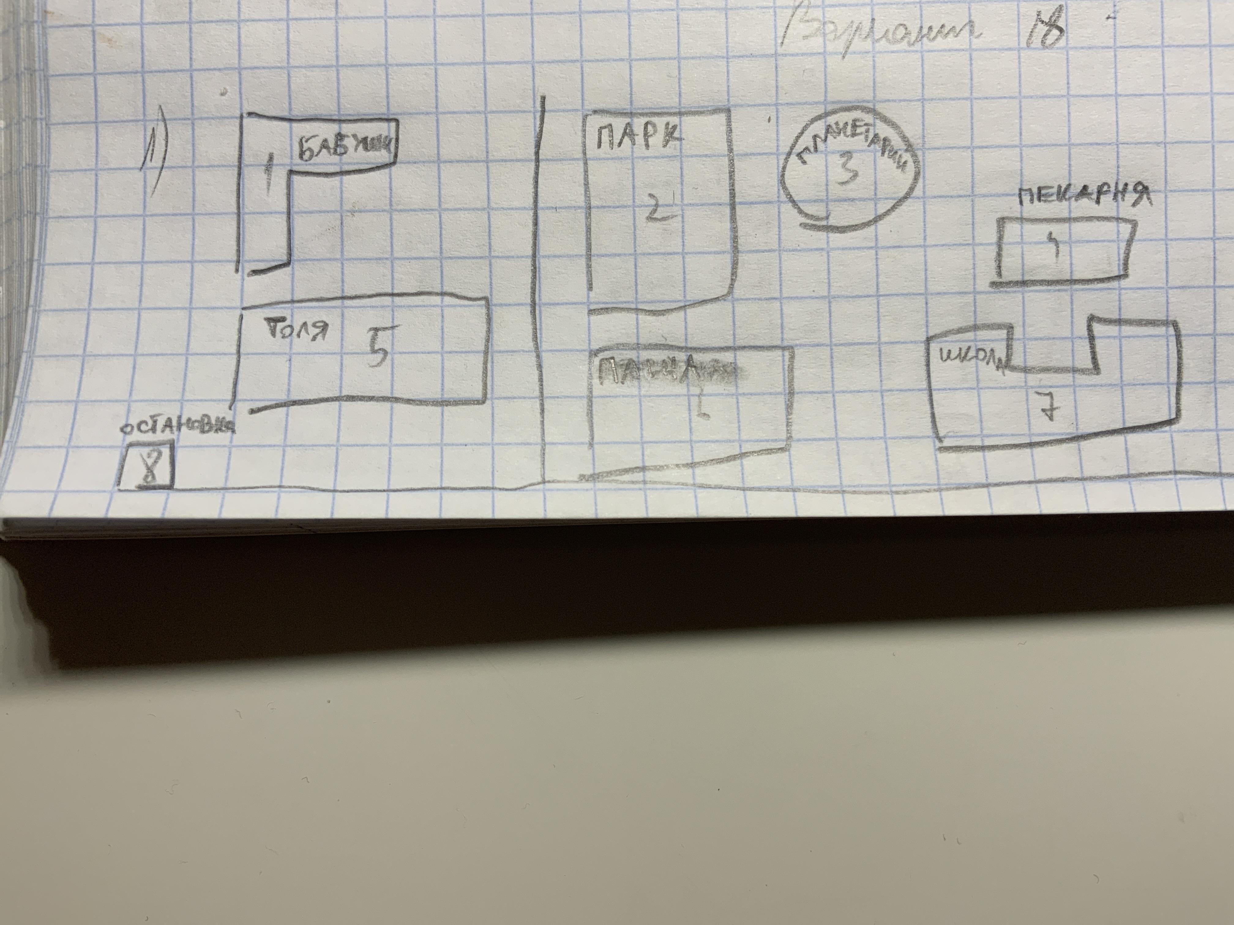Что ж, Дом Толи обозначен цифрой 5. 1 - его бабушки (буквой г) 2- парк через дорогу, а рядом планетарий - 3. Цифра 6 - дом Паши, а школа - 7 (буквой п) Рядом с домом Толи остаётся только 8 - остановка, а пекарня - 4 (в 7 клетках от парка)