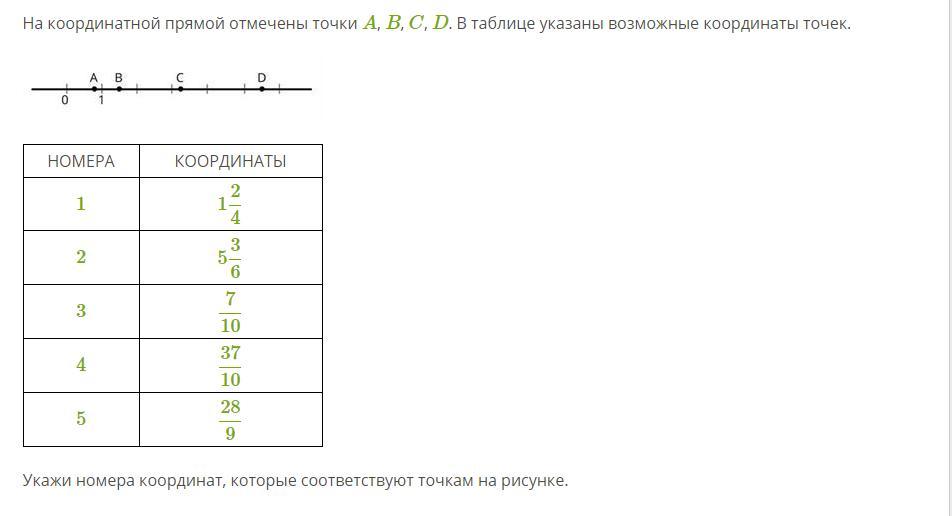 На координатной прямой отмечены точки A, B, C, D. В таблице указаны возможные координаты точек.