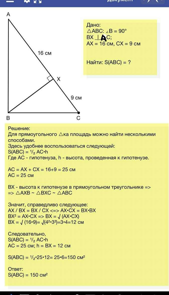 відрізки 16см і 9см. Обчислити площу трикутника.