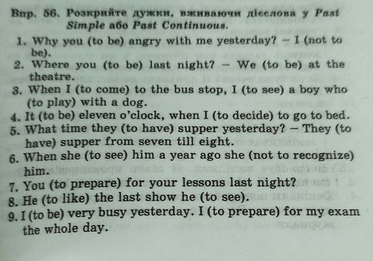 1 were you/wasnt 2 were you/were 3 came/saw/was playing 4 was/decided 5 did they have/were having 6 saw/didnt recognize 7didyou prepare 8 liked/saw 9 was/was preparing