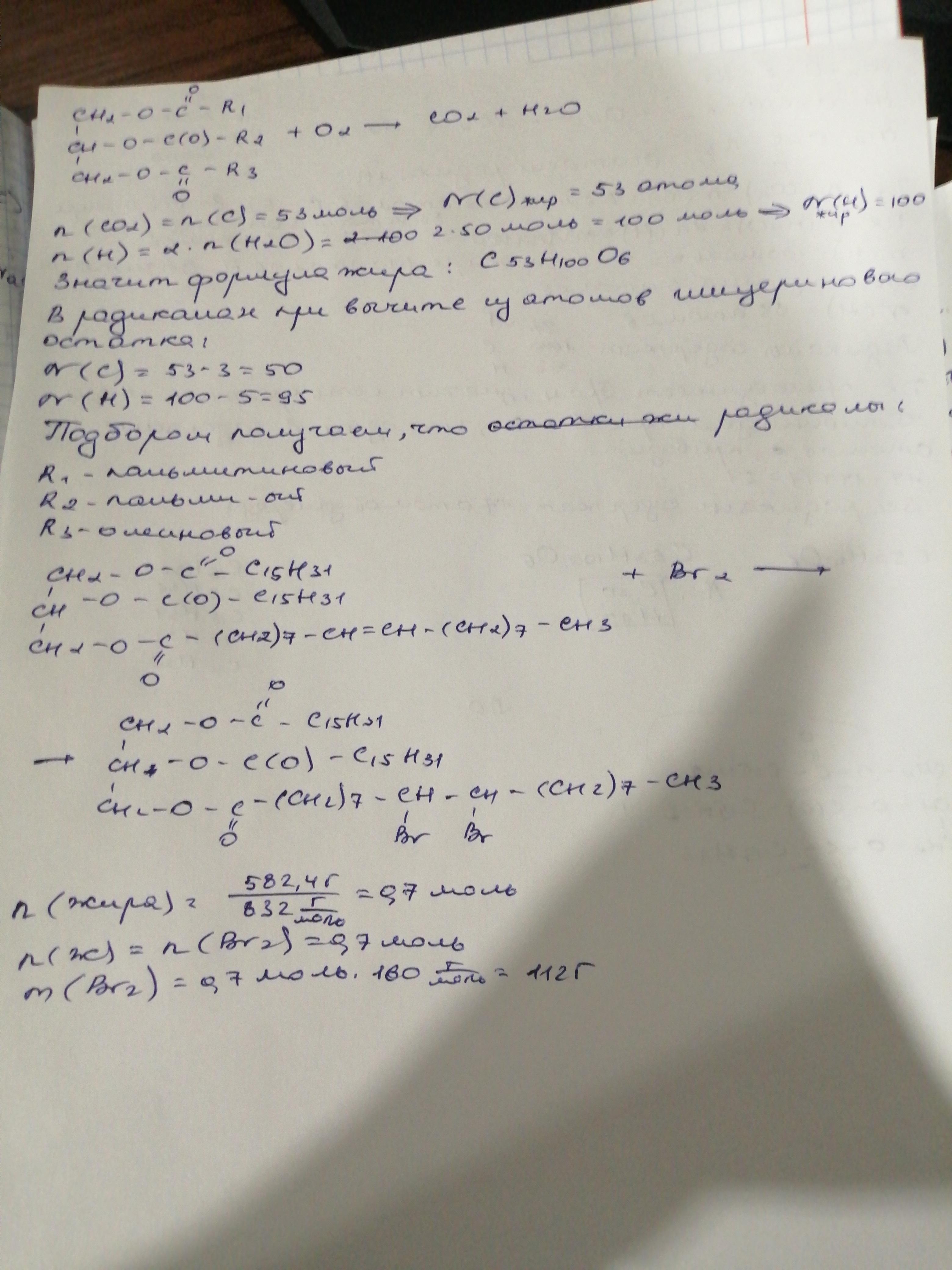 Вычислите массу брома, которую может присоединить такой жир массой 582,4 г.