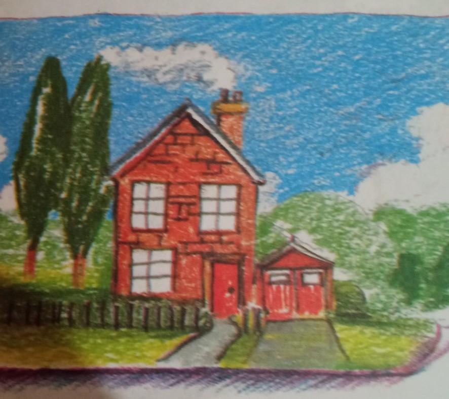 This is a brick house. There are three windows and one door. We also see a garage here, it has 2 windows and one door. Looking at the picture, we can say that this is a rural house, there is nothing nearby. There is a small vegetable garden next to the house. This is a very beautiful house.