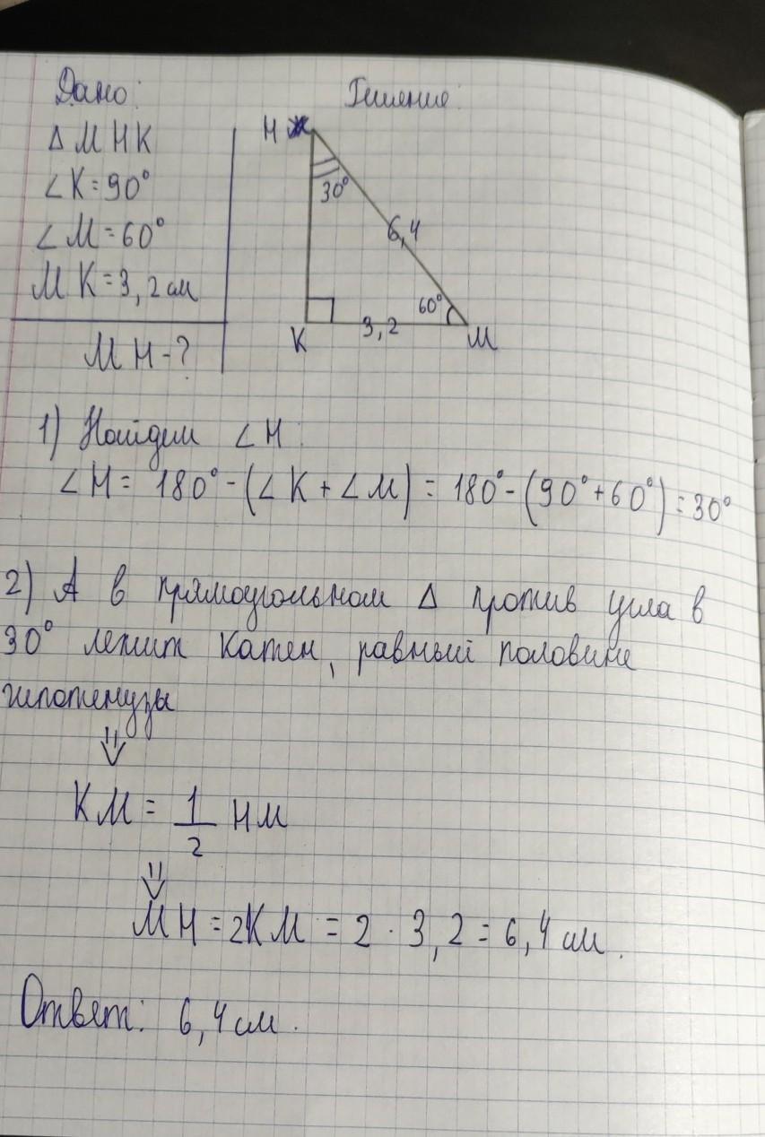 Рассмотрим треугольник MHK, угол K прямой, угол M = 60 градусам, отсюда угол H = 30 градусам, Мы знаем то, что против угла в 30 градусов лежит катет равен половине гипотенузе, в данном случае MK = 1 / 2 * MH, следовательно MH = 2 * MK = 3,2 * 2 = 6, 4