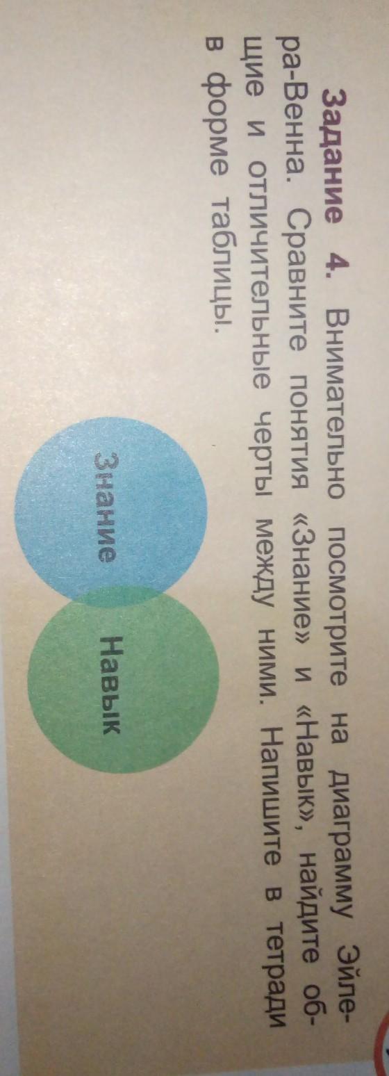 Помогите пожалуйста с воспитанием за 6 класс. Дам 10 баллов Задание 4. Внимательно посмотрите на диаграмму Эйлера-Венна. Сравните понятия "Знание" и "Навык", найдите общие и отличительные черты между ними. Напишите в тетради в форме тавлицы. Знание, Навык.