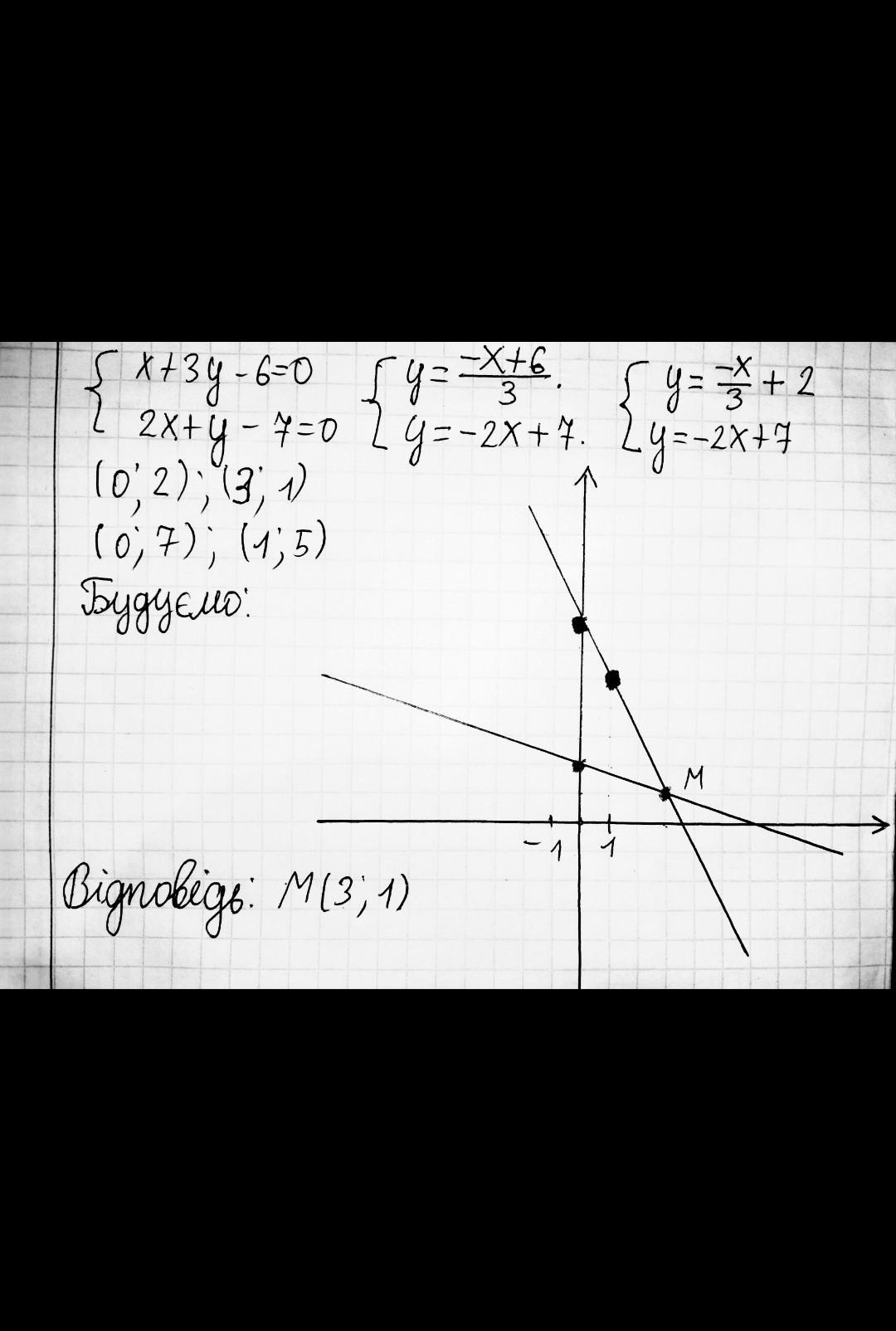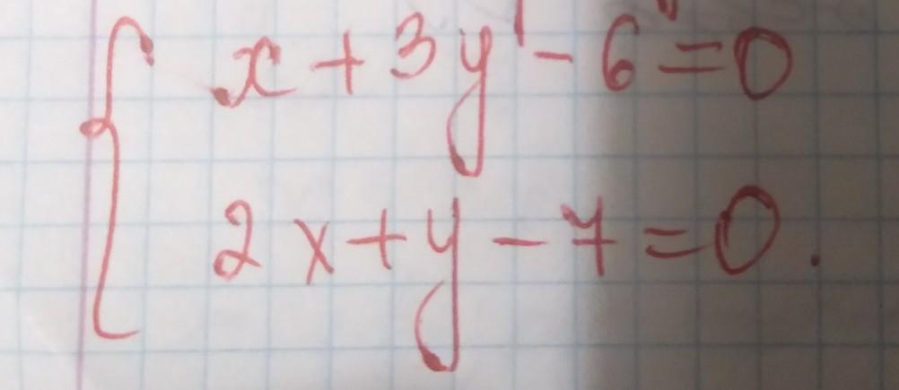 Если так, то это две прямые. Строим по 2-м точкам. Первая. При х=0, у=2; точка (0;2). При у=0, х=6; точка (6; 0). У второй аналогично (0; 7) и (3,5; 0). Проводим прямые по этим точкам. Получим (3; 1). Масштаб 2 клетки. Аккуратненько))