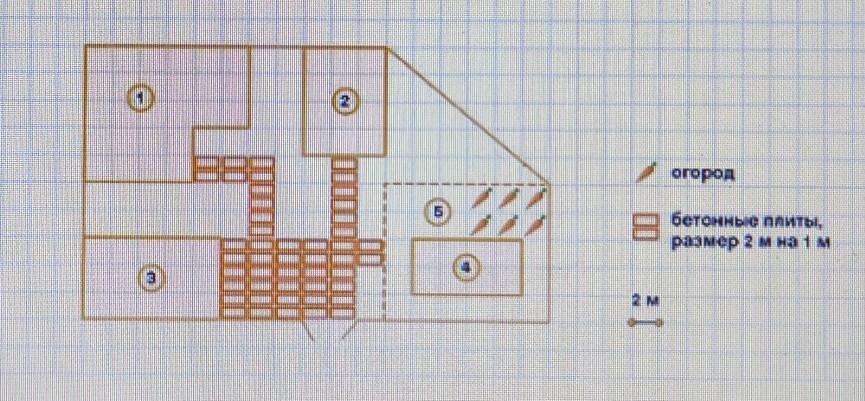 1 клетка = 2 плитки = 4 м^2 - дорожка к огороду и хозблоку.