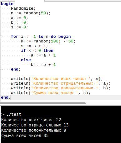 Программа генерирует будущее количество чисел. Это число созраняется в переменной n. Затем в цикле от 1 до n программа с помощью функции random(100)-50 генерирует числа в промежутке от -50 до 50. Затем происходит подсчет отрицательных чисел в переменную а, положительных - в переменную b.
