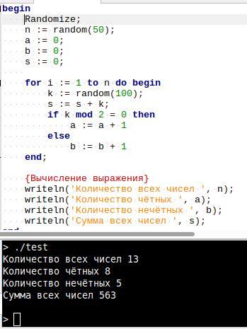 Затем, в цикле программа генерирует определённое количество чисел в промежутке от 0 до 100. С помощью функции mod проверяет их на чётность, и подсчитывает их, четные в переменной а, нечетные - в b.