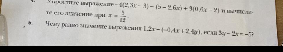 4. -4(2.3x-3) -(5-2,6x) +3(0,6x-2) = -9.2x + 12 - 5 +2.6x +1,8x - 6 = -4,8x + 1 =