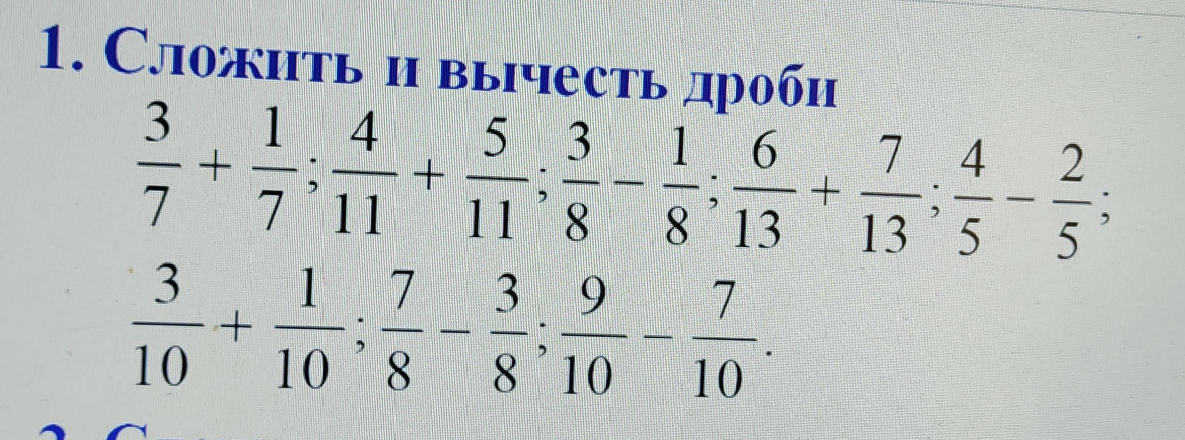 4/5-2/5=2/5;3/10+1/10=4/10;7/8-3/8=4/8; 9/10-7/10=2/10.( вот эта черта / это то что по середине если что)