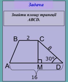 ВС и AD нам известны, СМ надо найти. Заметим, что треугольник СМD прямоугольный и имеет угол 30 градусов. По свойству прямоугольных треугольников катет, лежащий напротив угла в 30 градусов равен половине гипотенузы, а значит, СМ = ½*8=4;