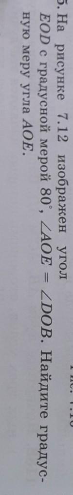 На рисунке 7.12 изображен угол EOD с градусной мерой 80 градусов, угол AOE=DOB. Найдите градусную меру угла AOE
