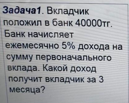 Пошаговое объяснение:если 40.000положил но 5% от этой сумы будет 5.000 умножаем на 3за три месяца:)))