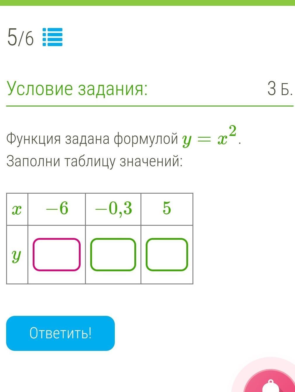х = -6; у = (-6)² = 36