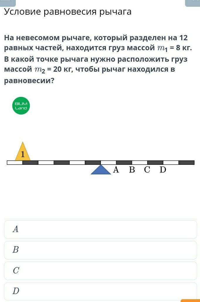 На невесомом рычаге, который разделен на 12 равных частей, находится груз массой m1 = 8 кг. В какой точке рычага нужно расположить груз массой m2 = 20 кг, чтобы рычаг находился в равновесии?