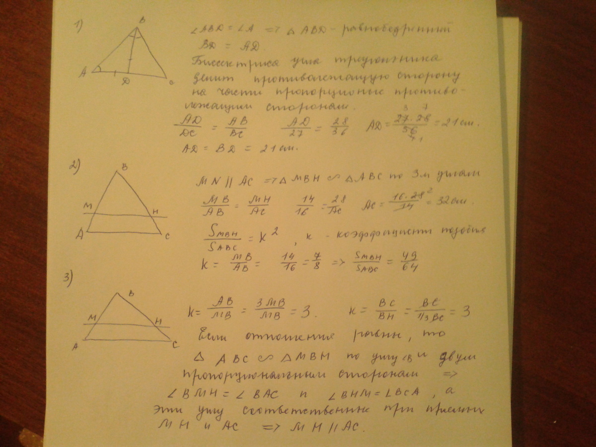 2. Прямая, параллельная стороне AC треугольника ABC, пересекает стороны AB и BC соответственно в точках M и H. Найдите AC и соотношение площадей треугольников ABC и BMH, если MB=14 см, AB=16 см, MH=28 см.