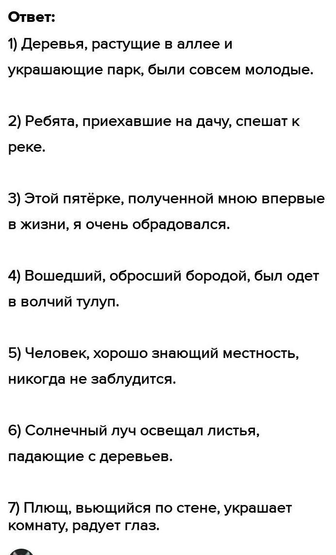 1) Деревья, которые растут в аллее и украшающие парк, были совсем молодые. 2) Ребята спешат к реке, приехавшие на дачу. 3) Пятерке я очень обрадовался, полученной мною впервые в жизни. 4) Вошедший был одет в волчий тулуп, обросший бородой. 5) Если человек хорошо знающий местность, он никогда не заблудится. 6) Солнечный луч освещал падающие листья с деревьев. 7) Плющ, который вьющийся по стене, украшает комнату, радует глаз.