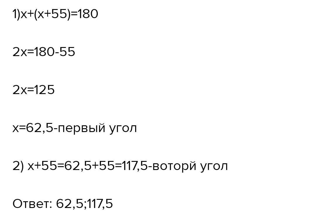 Один из смежных углов на55градусом больше другого найдите смежные угла пожалуйста быстрееееей скоро урок решение пожалуйста с рисунком заранее спасибо