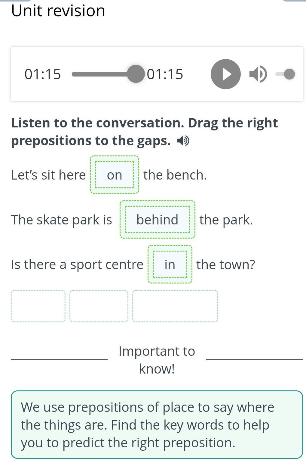 Listen to the conversation. Drag the right prepositions to the gaps.