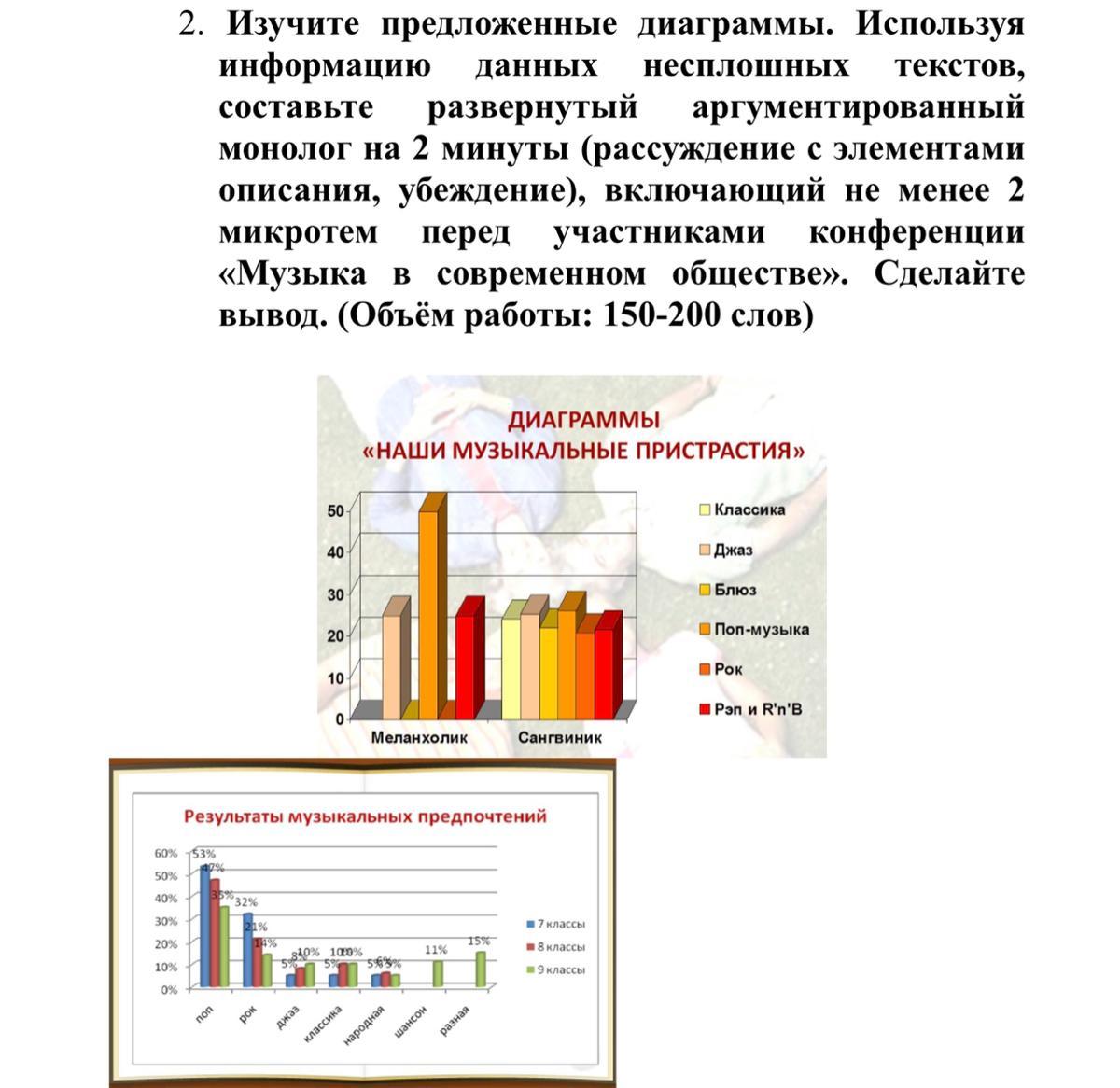 Изучите предложенные диаграммы. Используя информацию данных несплошных текстов, составьте развернутый аргументированный монолог на 2 минуты (рассуждение с элементами описания, убеждение), включающий не менее 2 микротем перед участниками конференции «Музыка в современном обществе». Сделайте вывод. (Объём работы: 150-200 слов)