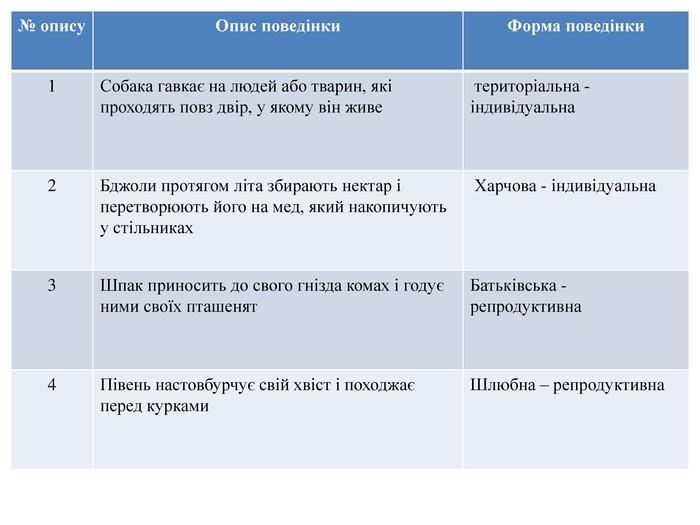 1. Впишіть у таблицю назву форми поведінки тварин , яка відповідає опису .