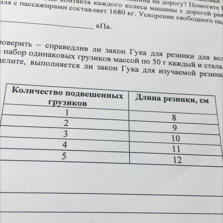 Алла решила проверить-справедлив ли закон Гука для резинки для волос. В кабинете физики она взяла набор одинаковых грузиков массой по 50г каждый и стала подвешивают их к резинке. Определите, выполняется ли закон гука для изучаемой резинки? Ответ кратко поясните