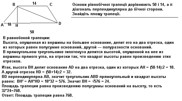 основи рівнобічної трапеції дорівнюють 50 і 14, а її діагональ перпендикулярна до бічної сторони. Знайдіть площу трапеції.
